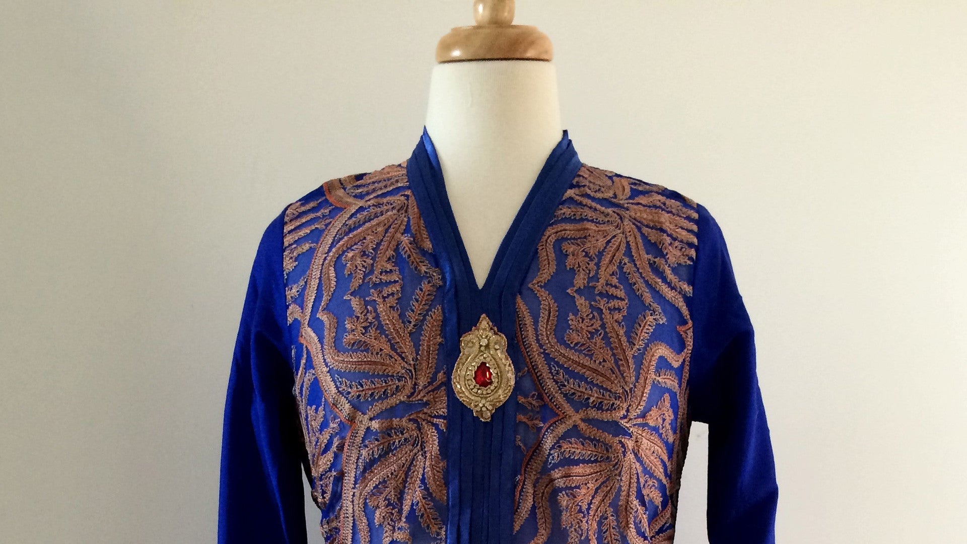 A beautiful chiffon kurta in electric Blue with Brown threadwork embroidery all down the front and silk back and sleeves.