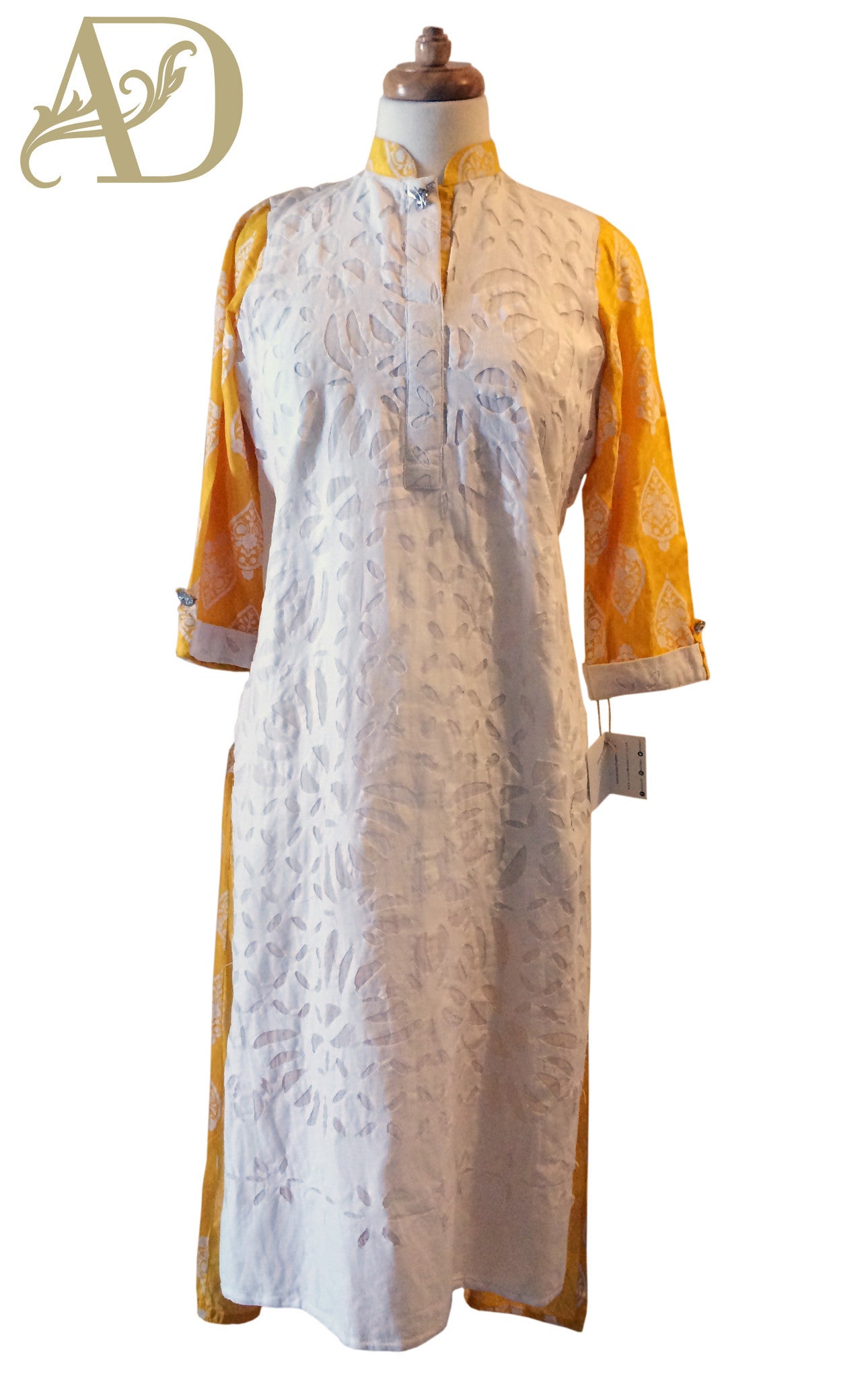 A white cutwork cotton Ralli kurta with three quarter sleeves and a contrasting yellow and white printed fabric, makes this kurta a very comfortable summer day wear. It has a shorter front hemline to the back.
